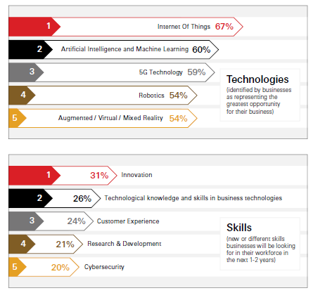 A number of new technologies have already been embraced by businesses and include AI (41%), the Internet of Things (40%), wearables (37%) and facial/image recognition (38%). The biggest benefits of employing these four technologies are improvements in productivity, customer experience and product or service quality.